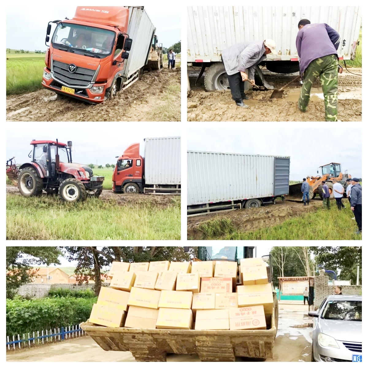 在物资运送至三台房村途中,因暴雨冲毁道路,运输车辆被迫绕行田间临时开辟的小路。行至一处泥泞路段时,满载物资的大货车深陷泥潭无法脱困。危急时刻,当地村民自发组织铲车、拖拉机参与救援,与志愿者们共同铺设防滑垫、挖掘排水沟。经过5个小时的不懈努力,物资被安全转移至村部,货车也成功脱险。村民们纷纷表示:“天灾无情人有情,感谢党和政府,感谢爱心企业的帮助!”