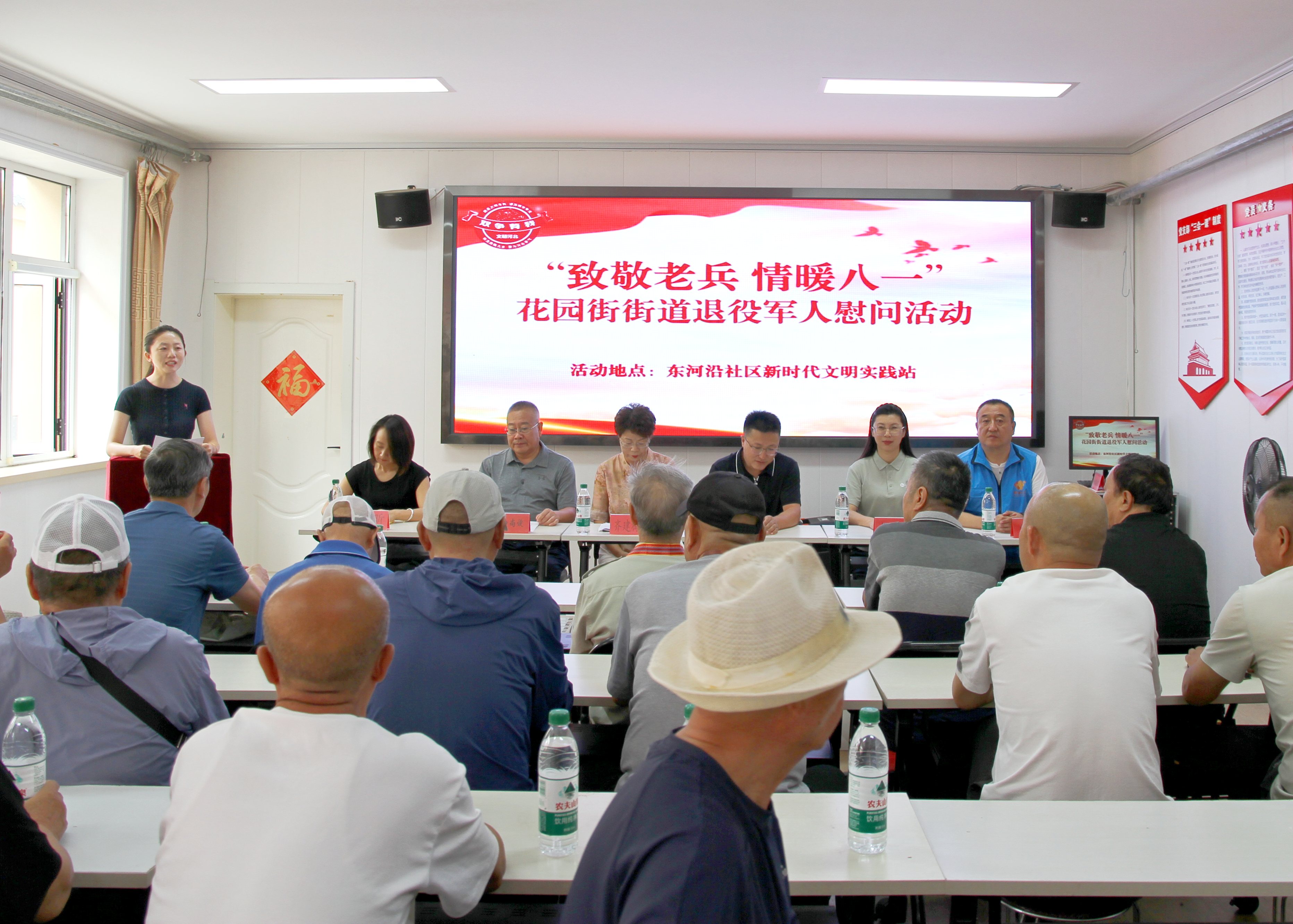 活动现场,东河沿社区退役军人服务站内暖意浓浓,二十余名退役老兵代表齐聚一堂,其中一位代表胸前的军功章熠熠生辉,与前方“致敬老兵 情暖八一”的横幅交相辉映,尽显庄重与温情。